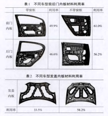 制作設(shè)計(jì)中,制作造型結(jié)構(gòu)的不同,材料利用率不同,不同的造型結(jié)構(gòu)對材料利用率的影響也比較大。一般車身前后門內(nèi)板有窗框的材料利用率低,無窗框的材料利用高率,如表1所示,造型奇特的材料利用率低,常規(guī)設(shè)計(jì)的材料利用率高,如表2所示。
